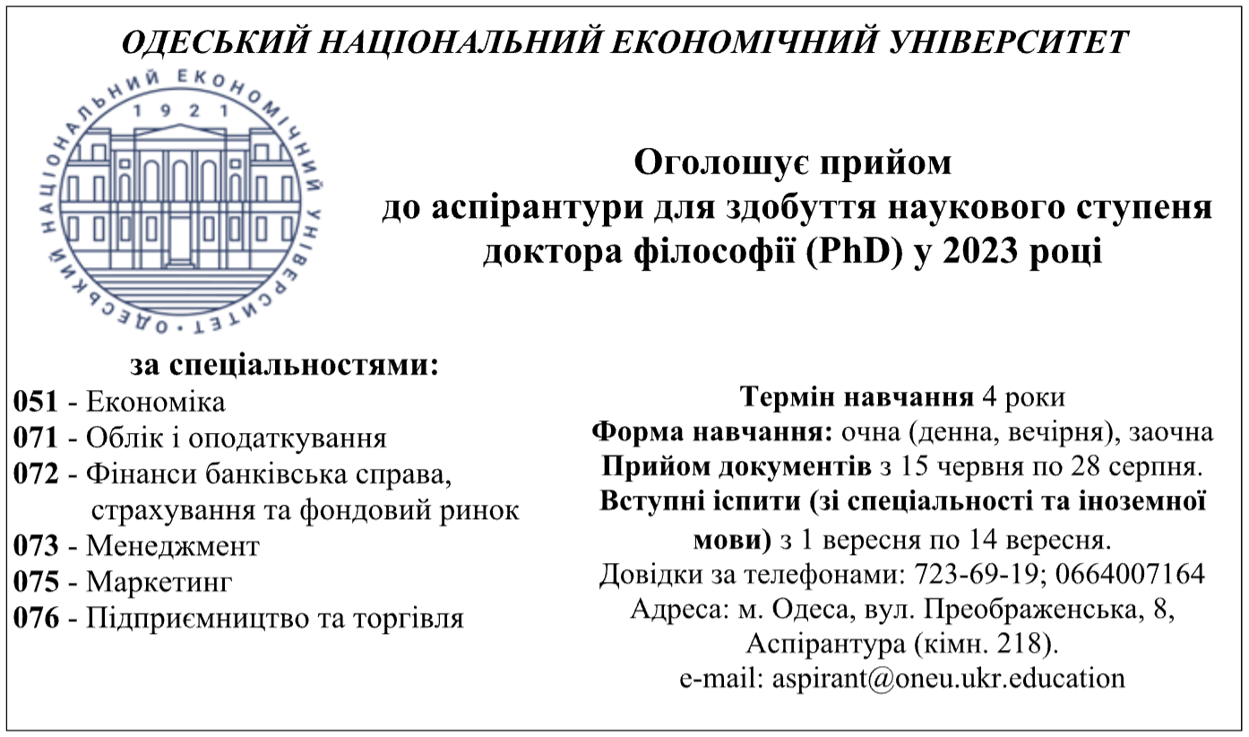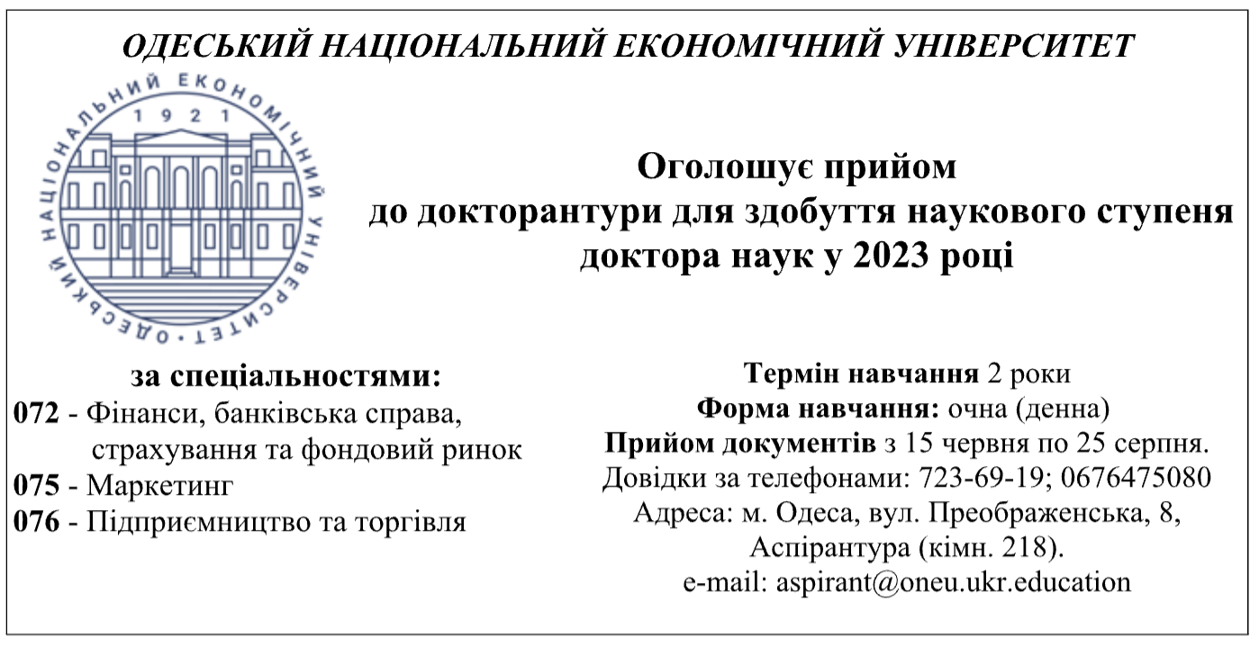 В Одеському національному економічному університеті відділ аспірантури та докторантури проводить роботу по удосконаленню підготовки науково-педагогічних кадрів через аспірантуру відповідно до сучасних вимог та наукових кадрів вищої кваліфікації – докторів наук. Аспірантура ОНЕУ діє з 1947 року, у свою чергу докторантуру відкрито у 1988 році. Відділ аспірантури та докторантури є структурним підрозділом університету, підпорядкований ректору та проректору з наукової роботи, діє на підставі Статуту університету, Порядку підготовки здобувачів вищої освіти ступеня доктора філософії та доктора наук у вищих навчальних закладах (наукових установах), керується вказівниками ректора, Правилами внутрішнього розпорядку і чинним законодавством. Основним завданням відділу є організація підготовки спеціалістів вищої кваліфікації, виконання наказів і розпоряджень міністерства і ректора університету стосовно підготовки науково-педагогічних та наукових кадрів, дотримання принципу добору здобувачів вчених ступенів за їхніми кваліфікаційними і науковими якостями. Починаючи з 2016 року в ОНЕУ підготовка здобувачів вищої освіти ступеня доктора філософії та доктора наук провадиться згідно правил, визначених Постановою Кабінету Міністрів України № 261 від 23.03.2016 р. «Про порядок підготовки здобувачів вищої освіти ступеня доктора філософії та доктора наук у вищих навчальних закладах (наукових установах)». На даний час в університеті підготовка аспірантів та докторантів для отримання наукових ступенів доктора філософії та доктора наук провадиться за наступними спеціальностями: 051 – Економіка 071 – Облік і оподаткування 072 – Фінанси, банківська справа, страхування та фондовий ринок 073 – Менеджмент 075 – Маркетинг 076 – Підприємництво та торгівля. Детальніше у розділі Вступнику Положення про відділ аспірантури та докторантури Одеського національного економічного університету.