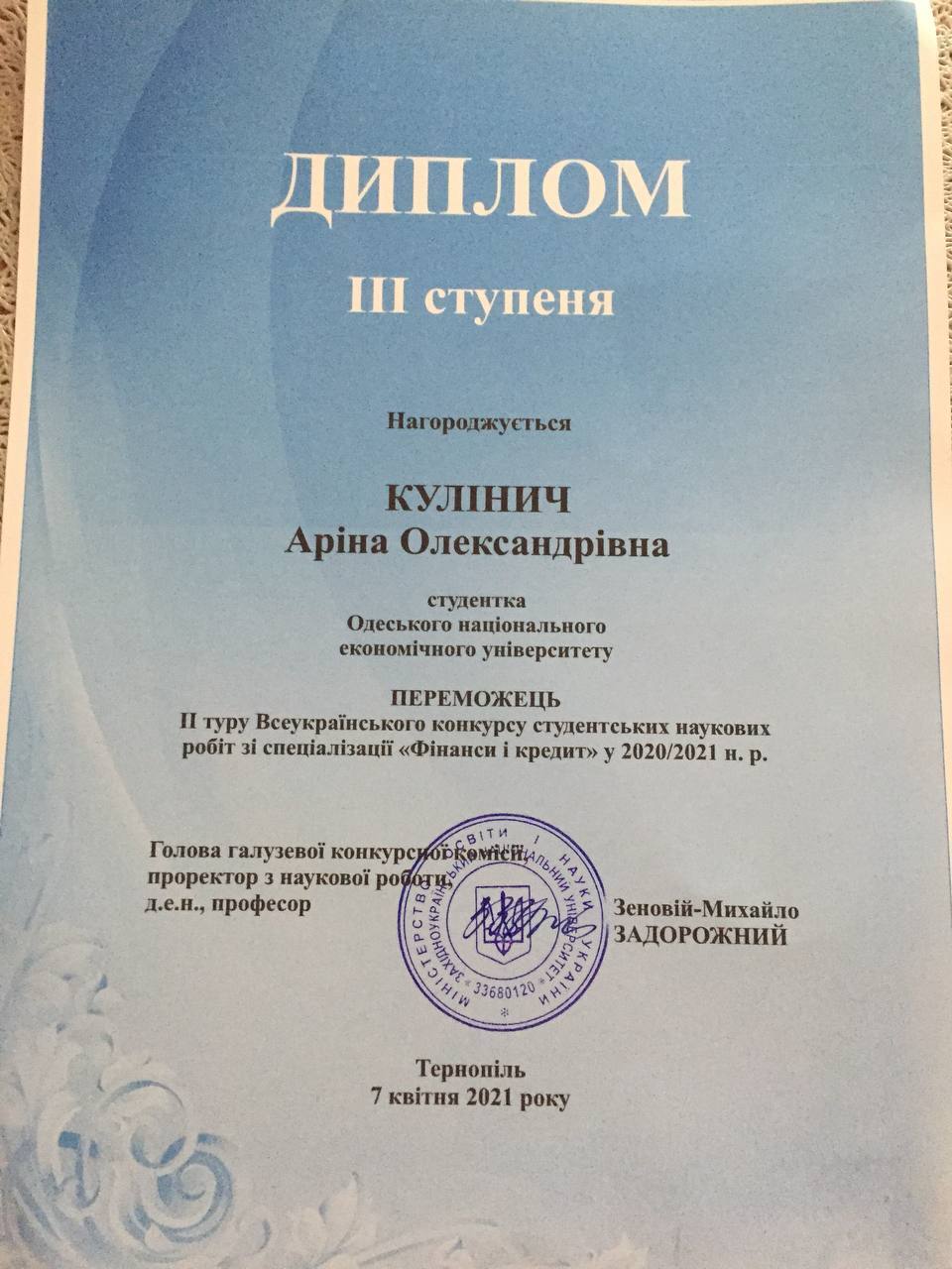 Вітаю! Мене звати Аліна. З 2018 року є студенткою Одеського національного економічного університету, навчаюся на 4 курсі факультету фінансів та банківської справи за спеціальністю 072 «Фінанси, банківська справа та страхування». Моє студентське життя є досить активним та яскравим. Протягом всього періоду навчання постійно підвищую свій професійний, зокрема і науковий рівень розвитку. Приймаю участь у Всеукраїнських та Міжнародних науково-практичних конференціях, шляхом публікації тез доповідей, а також наукових заходах на рівні університету, форумах, студентських наукових конференціях, круглих столах, доповідаючи результати своїх досліджень у сфері економіки, фінансів та бізнесу.