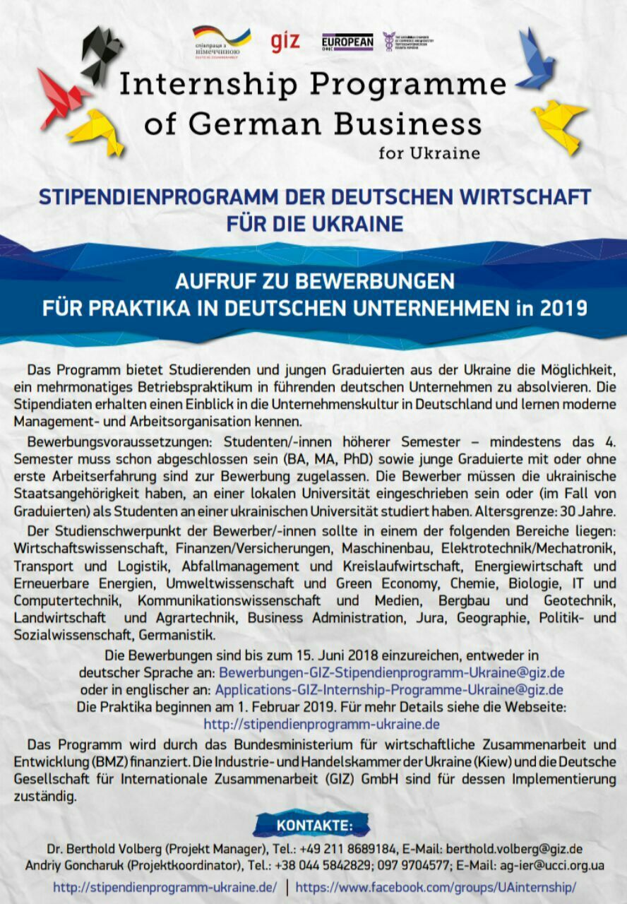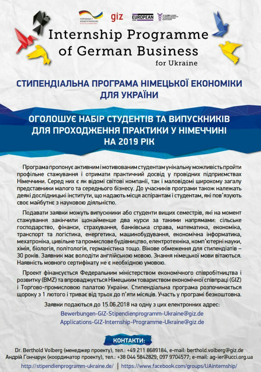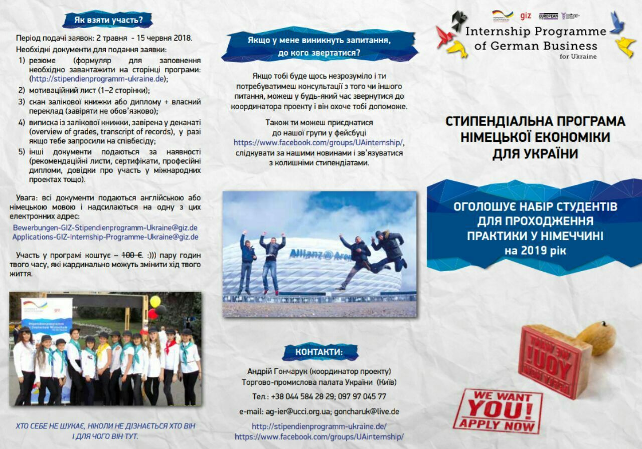 Повідомляємо, що до 15 червня ц.р. наші студенти мають можливість подати заявку на участь у програмі стажувань на підприємствах Німеччини.