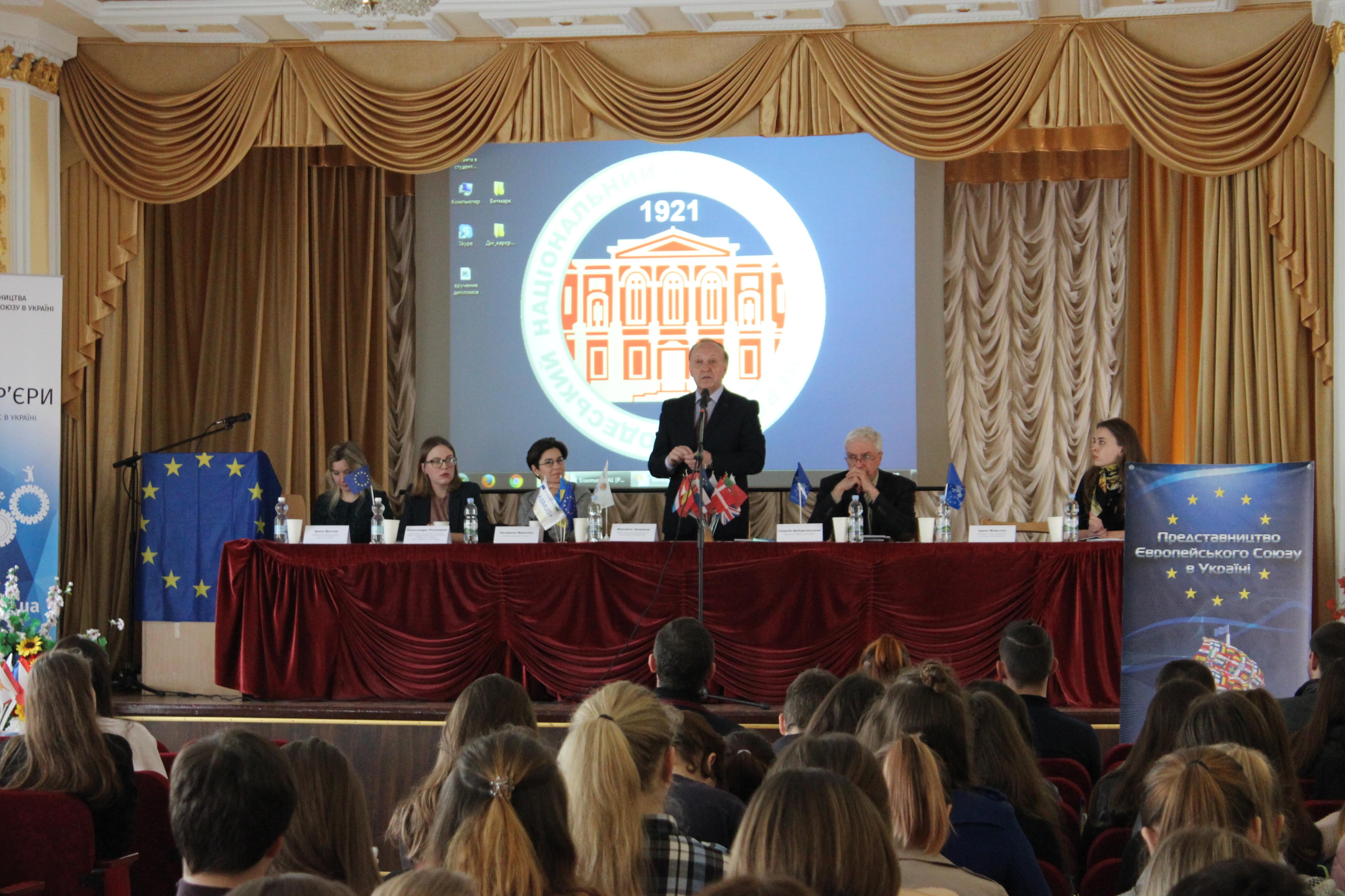 На зустрічі з адміністрацією університету, викладачами та студентами Одеського національного економічного університету, Одеського національного університету ім. І.І. Мечникова, Одеської національної юридичної академії, Одеського національного політехнічного університету та Одеського Регіонального Інституту Державного Управління обговорювалася тема, яка є дуже актуальною та нагальною для України, а саме: «Майбутні перспективи взаємовідносин між ЄС та Україною».
