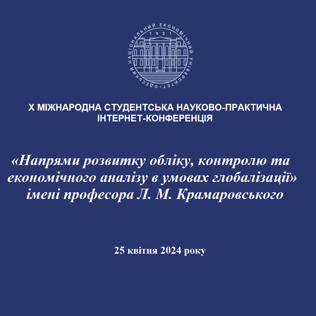 Запрошує Вас узяти участь у роботі X Міжнародної студентської науково-практичної Інтернет-конференції: «Напрями розвитку обліку, контролю та економічного аналізу в умовах глобалізації» імені Л. М. Крамарівського, яка відбудеться 25 квітня 2024 року.
