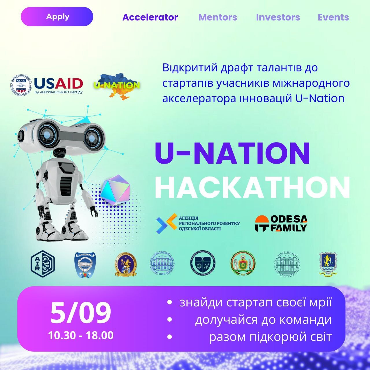 Мета одноденного хакатону – є залучення талантів до стартап команд, що братимуть участь в міжнародному акселераторі інновацій – U-Nation Startup Accelerator.