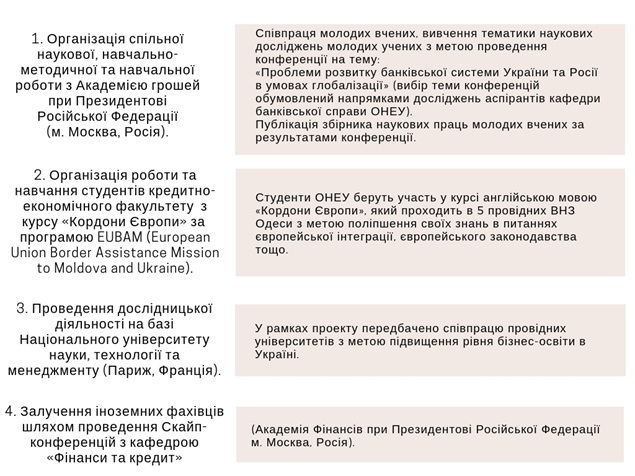 виконання госпрозрахункових тем «Методичні основи активізації взаємодії банківського і реального секторів економіки України» (Фермерське господарство «Гранат», 15 лютого-15 червня 2019 ), «Організація взаємовідносин банку та клієнтів в умовах цифровізації» (ПАТ «МТБ», 15 березня – 15 червня 2020 р.), «Оцінка конкурентного середовища на кредитному ринку України» (ПАТ «МТБ» 24 березня – 24 червня 2021 р.