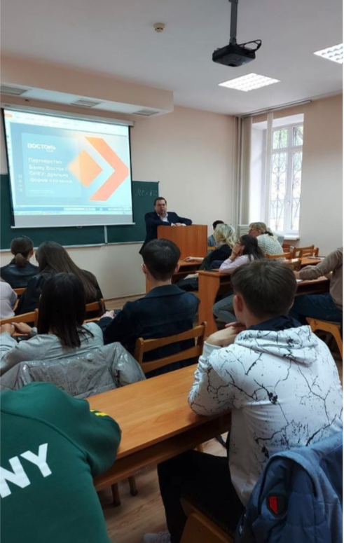 22 вересня відбулася зустріч Голови Правління ПАТ «Банк Восток» В.В. Мороховського із студентами 1-2 курсу Факультету фінансів та банківської справи з приводу запуску на базі освітньої програми «Міжнародний банківський бізнес» дуальної форми здобуття освіти (далі ДФЗО). ПАТ «Восток» виступає провідним партнером Одеського національного економічного університету щодо запровадження ДФЗО на спеціальності 072 «Фінанси, банківська справа та страхування».