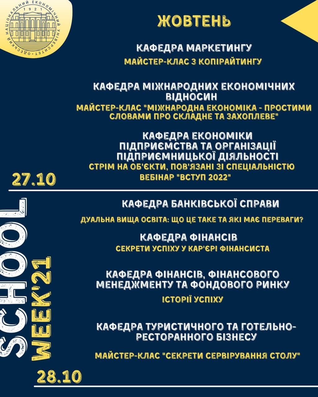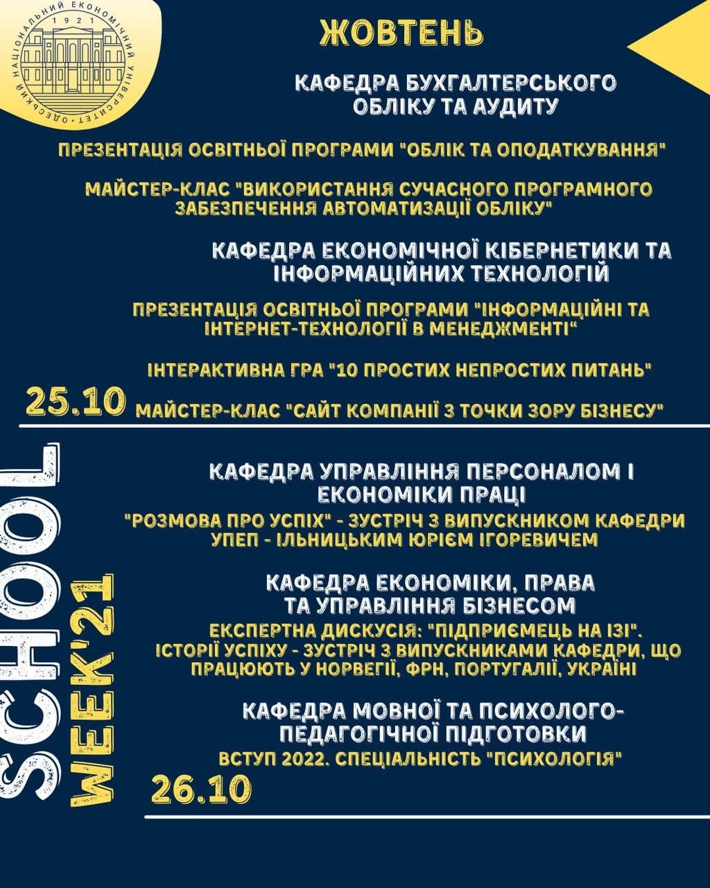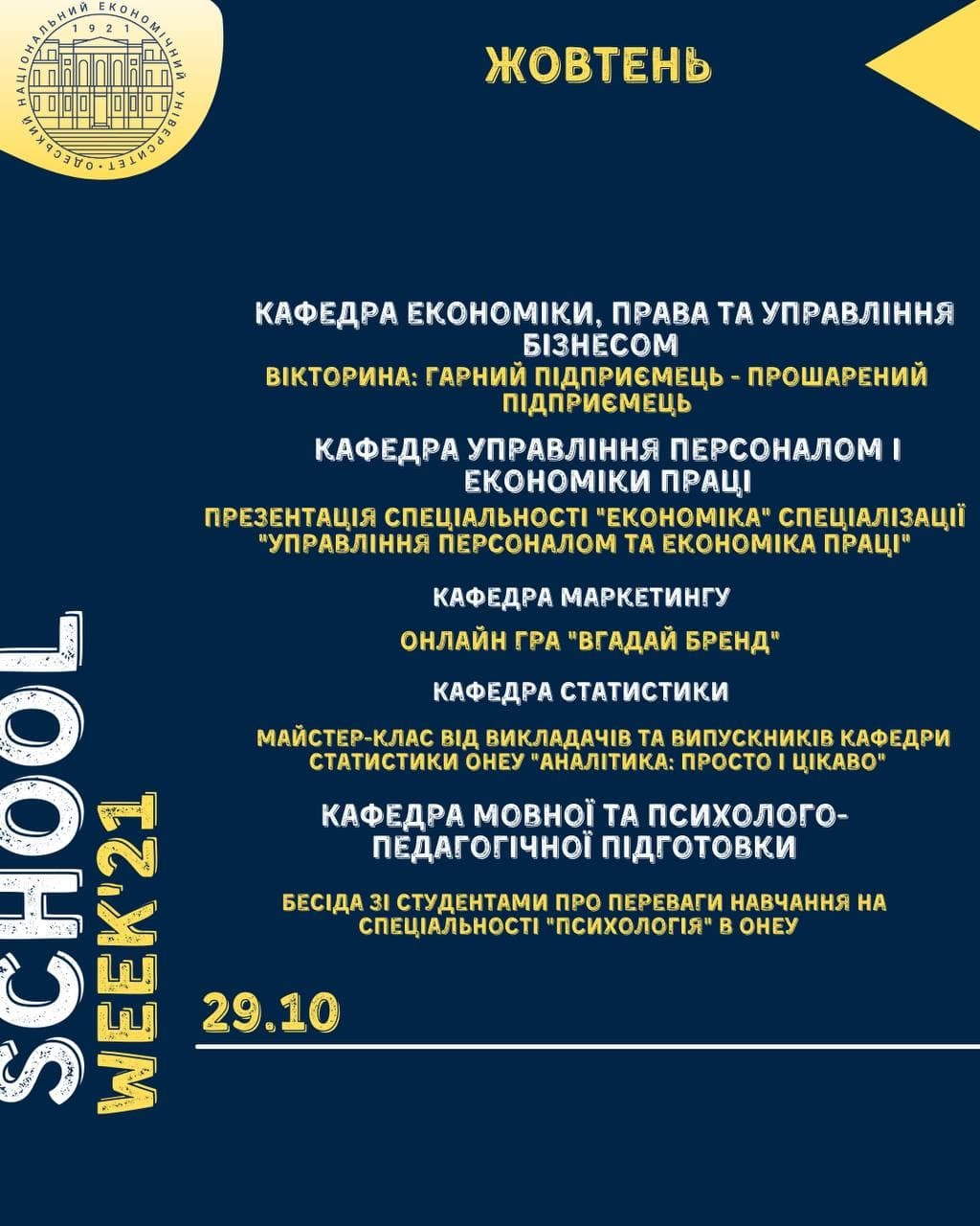 School week online в ОНЕУ – це можливість поринути у цікавий світ економіки з будь-якої точки України! ? Насичена програма цікавих заходів під час осінніх канікул!