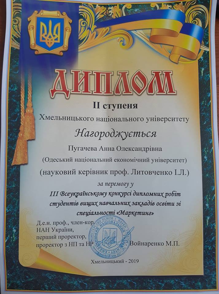 ?Випускниця магістратури, Пугачова Анна, привезла 2-е місце у Всеукраїнському конкурсі дипломних робіт студентів вищих навчальних закладів за спеціальністю “Маркетинг” у Хмельницькому національному університеті?