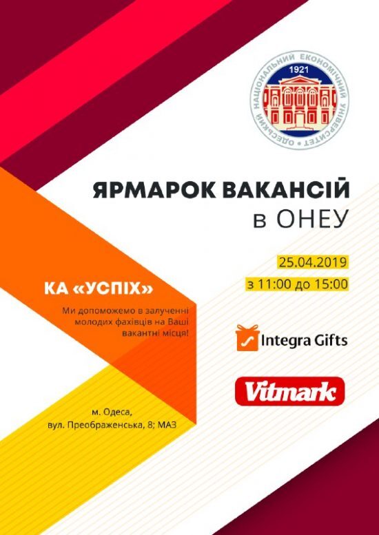 ?25 квітня 2019 року в ОНЕУ відбувся щорічний Ярмарок Вакансій, на якому студенти різних закладів вищої освіти та учні шкіл змогли більше дізнатись про ринок праці в Україні. Вони мали можливість поспілкуватися з представниками 32 організацій, які зацікавлені в нових співробітниках.