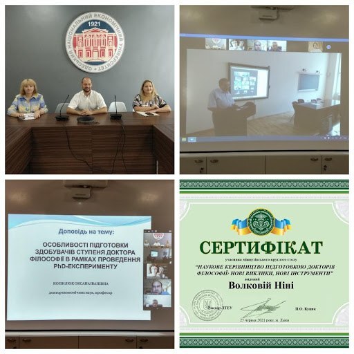 25 червня 2021 року наукові керівники здобувачів третього рівня вищої освіти ОНЕУ прийняли участь в міжуніверситетському круглому столі: «Наукове керівництво підготовкою докторів філософії: нові виклики, нові інструменти». Круглий стіл відбувся у форматі ZOOM конференції, в якій прийняли участь ВНЗ з різних куточків України. На круглому столі наукові керівники мали змогу поділитися своїм досвідом керівництва здобувачами степеню PhD, труднощами, які виникають під час підготовки докторів філософії та моментами, яким слід приділяти більшу увагу. Від нашого університету з доповіддю щодо якості наукового керівництва здобувачами третього рівня вищої освіти виступила завідувач кафедри економічного аналізу Волкова Ніна Анатоліївна. Всі учасники висловили свою подяку організаторам та доповідачам круглого столу, за результатами якого отримати сертифікати.